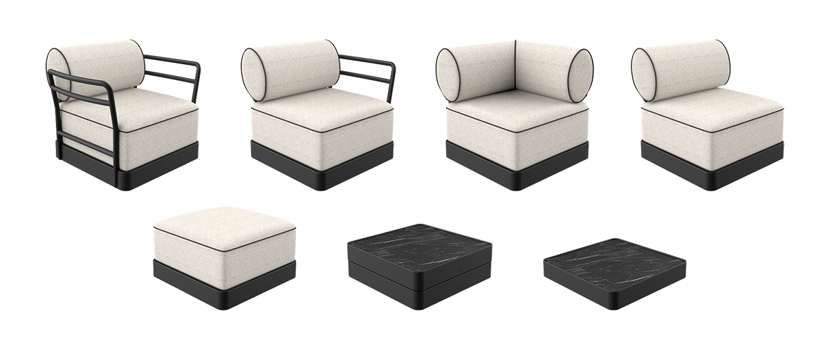 Brisa n'impose pas de structure fermée. Il part d'une unité minimale, un siège sans accoudoirs, qui sert de point de départ à des configurations infinies. De là naissent des compositions qui peuvent être intimes ou expansives, solitaires ou collectives. L'ajout d'accoudoirs, de coins, de poufs ou de tables d'appoint n'est pas seulement un geste fonctionnel, mais une manière de redessiner l'espace, de réinventer l'acte de s'asseoir. Chaque module fonctionne comme une pièce architecturale : un fragment qui peut être ordonné et désordonné avec la liberté qu'exige la vie contemporaine.