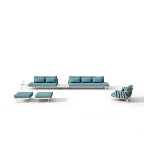 Système de canapés avec structure en aluminium laqué, coussins et tapissés parfaits pour l'extérieur, et dossier en ruban de passementerie tressée sur des tubes en aluminium. Vaste gamme de couleur et combinaisons à choisir parmi les couleurs en option.
