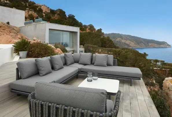 Sistema de sofas con estructura de aluminio lacada, cojines y tapizados idóneos para el exterior, y respaldo en cinta de pasamanería trenzada sobre tubo de aluminio. Amplia gama cromática y combinaciones para escoger entre cojines opcionales.